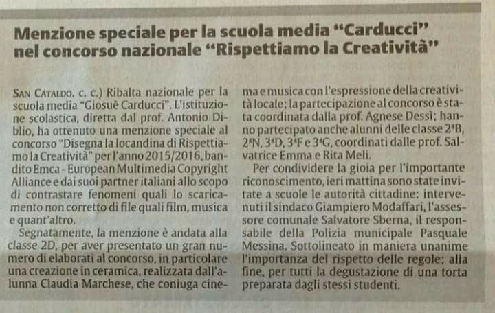 Giorno 30 maggio nell’elegante cornice del teatro Pirandello di Agrigento, la classe II H della scuola secondaria di I grado Carducci, plesso Balsamo di San Cataldo, diretta dal Prof. Antonio Diblio, è stata premiata quale classe vincitrice del concorso regionale di tutela ambientale Scopritarta organizzato dal libero consorzio di Agrigento. Per il concorso al quale hanno partecipato con centinaia di elaborati classi appartenenti a scuole primarie e secondarie di primo grado delle province di Agrigento, Caltanissetta, Palermo, Ragusa, Siracusa, Catania e Messina, gli alunni della II H, guidati dalla docente referente Prof.ssa Valentina Tesoro, hanno realizzato un breve video sulla salvaguardia della tartaruga caretta caretta sottolineando i pericoli che ne minacciano la popolazione nel Mediterraneo, soprattutto la pesca professionale, ma anche l’inquinamento e il disturbo antropico in varie forme. Nella mattinata inoltre gli alunni hanno vissuto un momento di grande emozione quando hanno assistito alla liberazione nel mare di San leone di una delle tartarughe curate presso il centro del WWF di Lampedusa, un piccolo e simpatico esemplare chiamato Leone per il coraggio e la forza di volontà dimostrate nel voler guarire a tutti i costi dopo l’intervento di rimozione di una lenza ingoiata in mare che avrebbe soffocato l’intestino. Gli alunni della classe II H sono: Cirneco Ilaria, Cusimano Federica, Dell'utri Eliseo, Falzone Erika Pia, Falzone Martina, Falzone Vanessa, Falzone Vincenzo, Ferrara Andrea, Ferrato Corinne, Fiore Soraya , Leo Martina Pia, Lipani Cataldo, Lunetta Salvatore Pio, Macaluso Silvia, Maligno Alessandra Maria, Mannarino Mariella , Marcenò Giorgio, Pitruzzella Gabriele, Scarlata Matteo Francesco e Vertolone Simona.